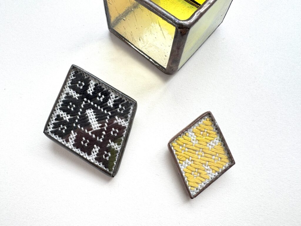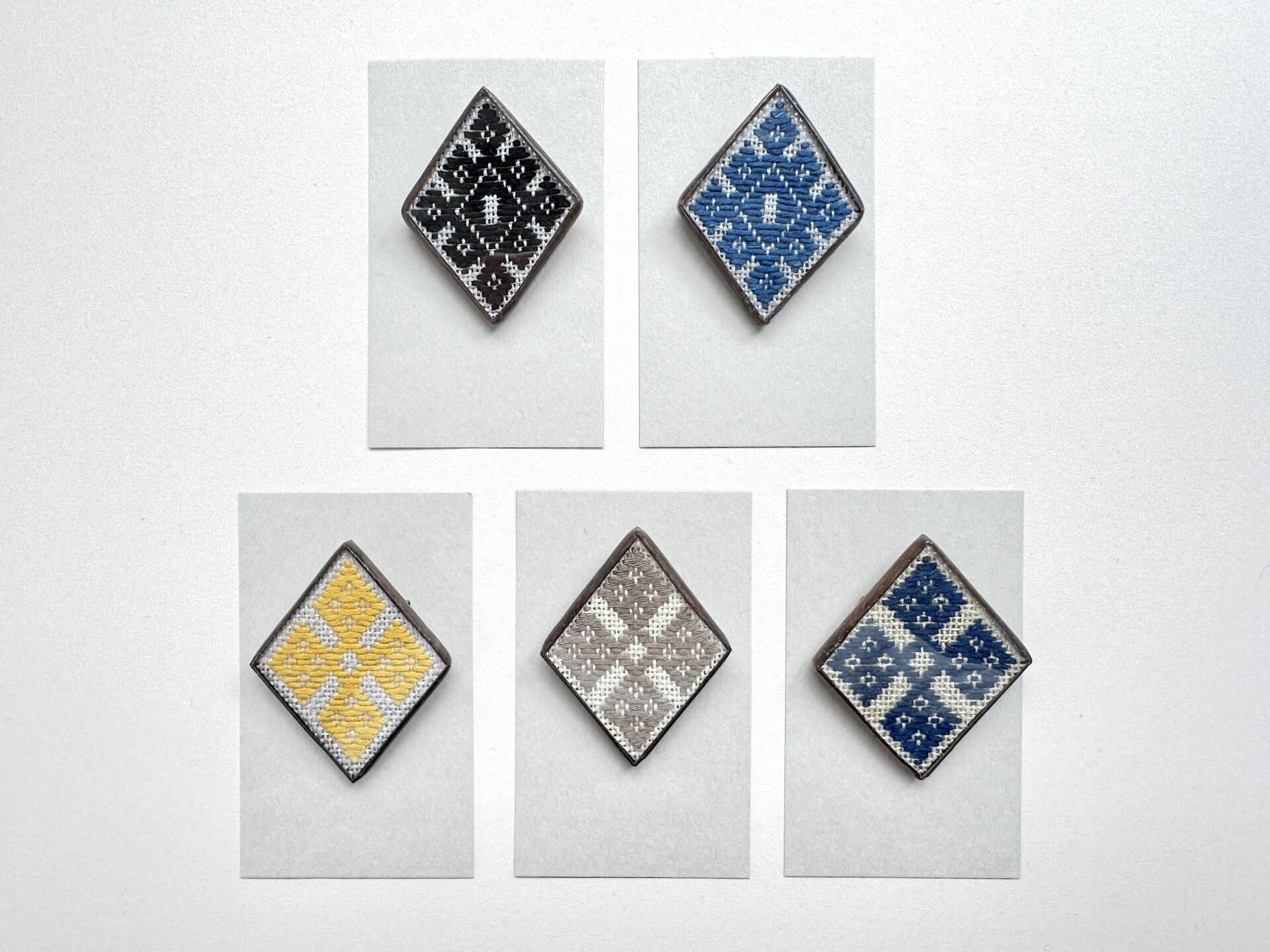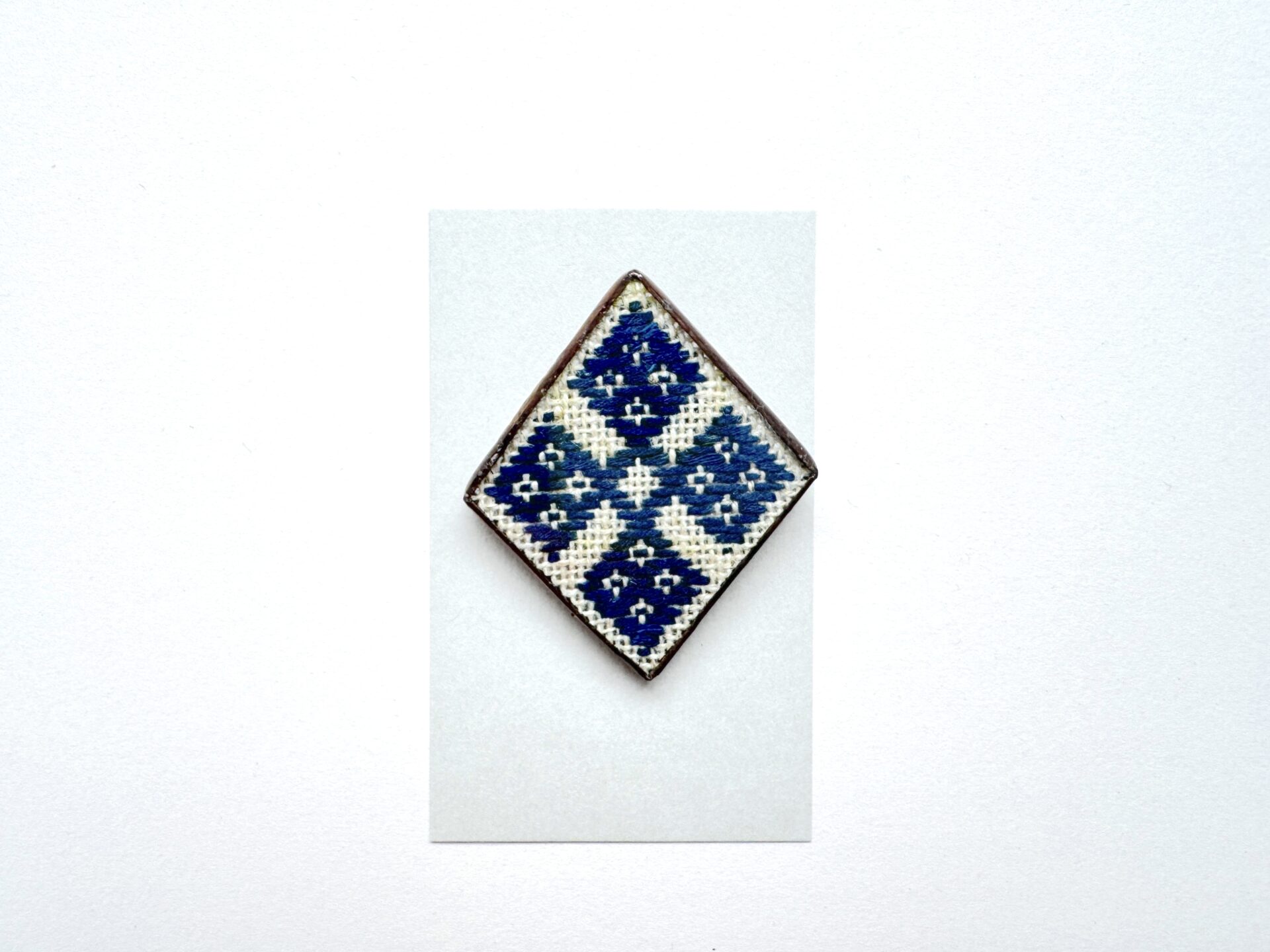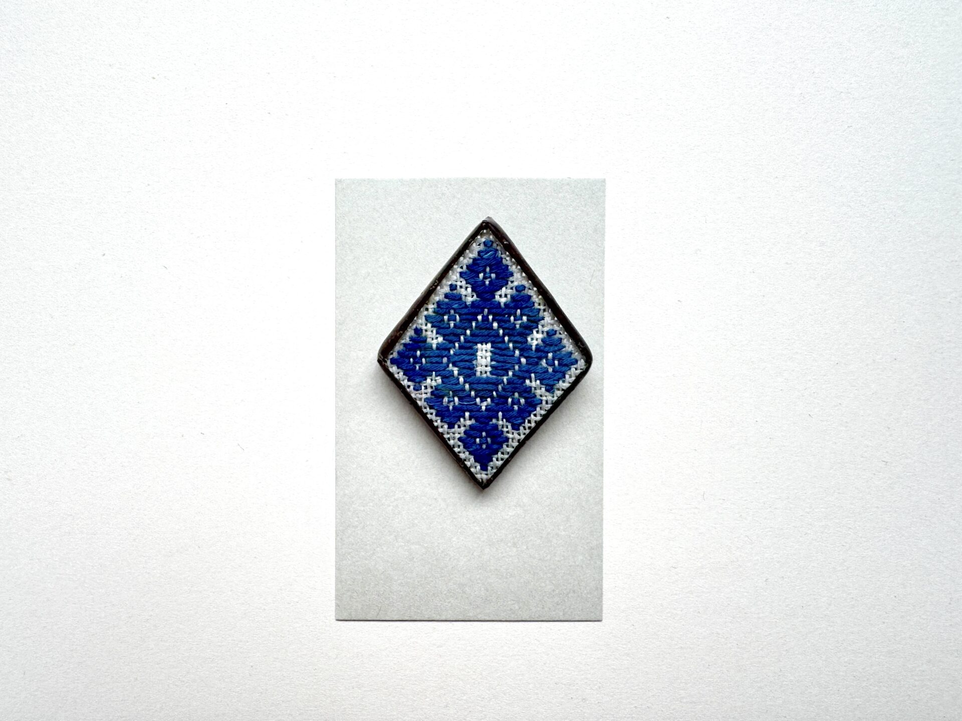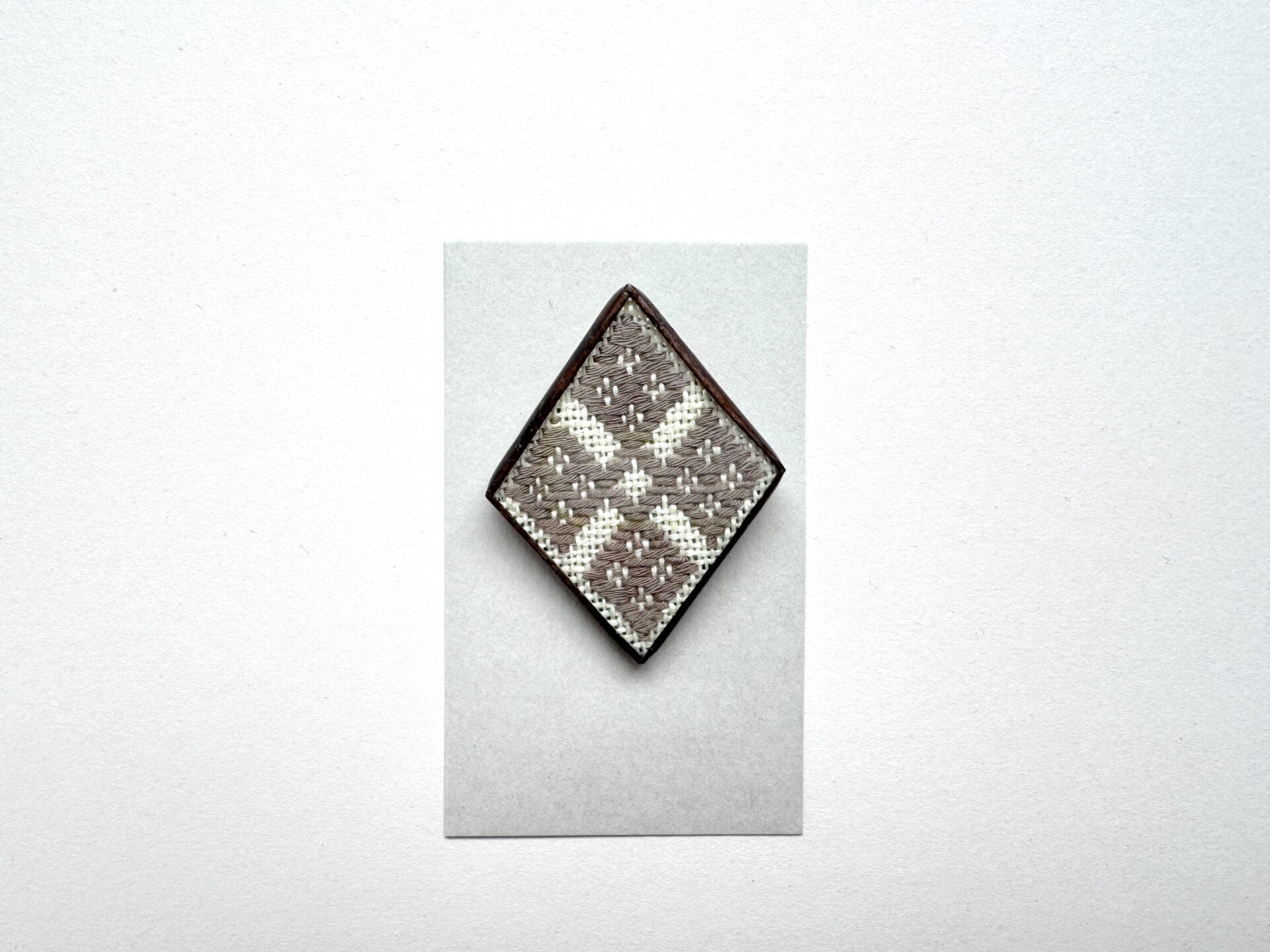 こぎん刺し作家・ハリノヲト植木友子さんに学び、ステンドグラスの技法を用いてこぎん刺し独特のモドコ(図案)をそのまま菱形のブローチに仕立てています。刺しものにガラスと金属のクールな質感が加わり、大人の装いにぴったりのブローチに。