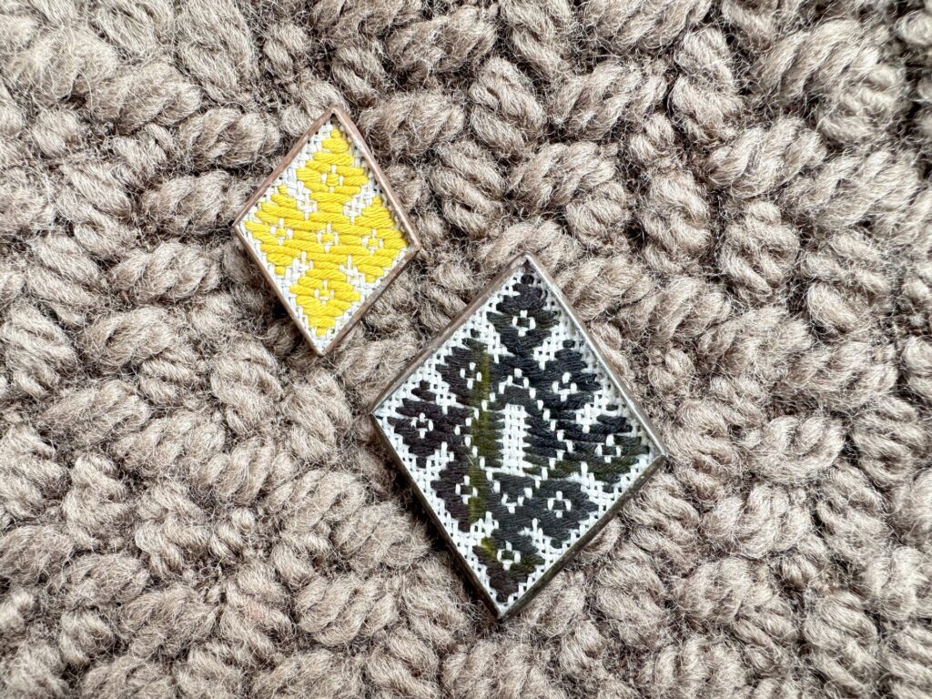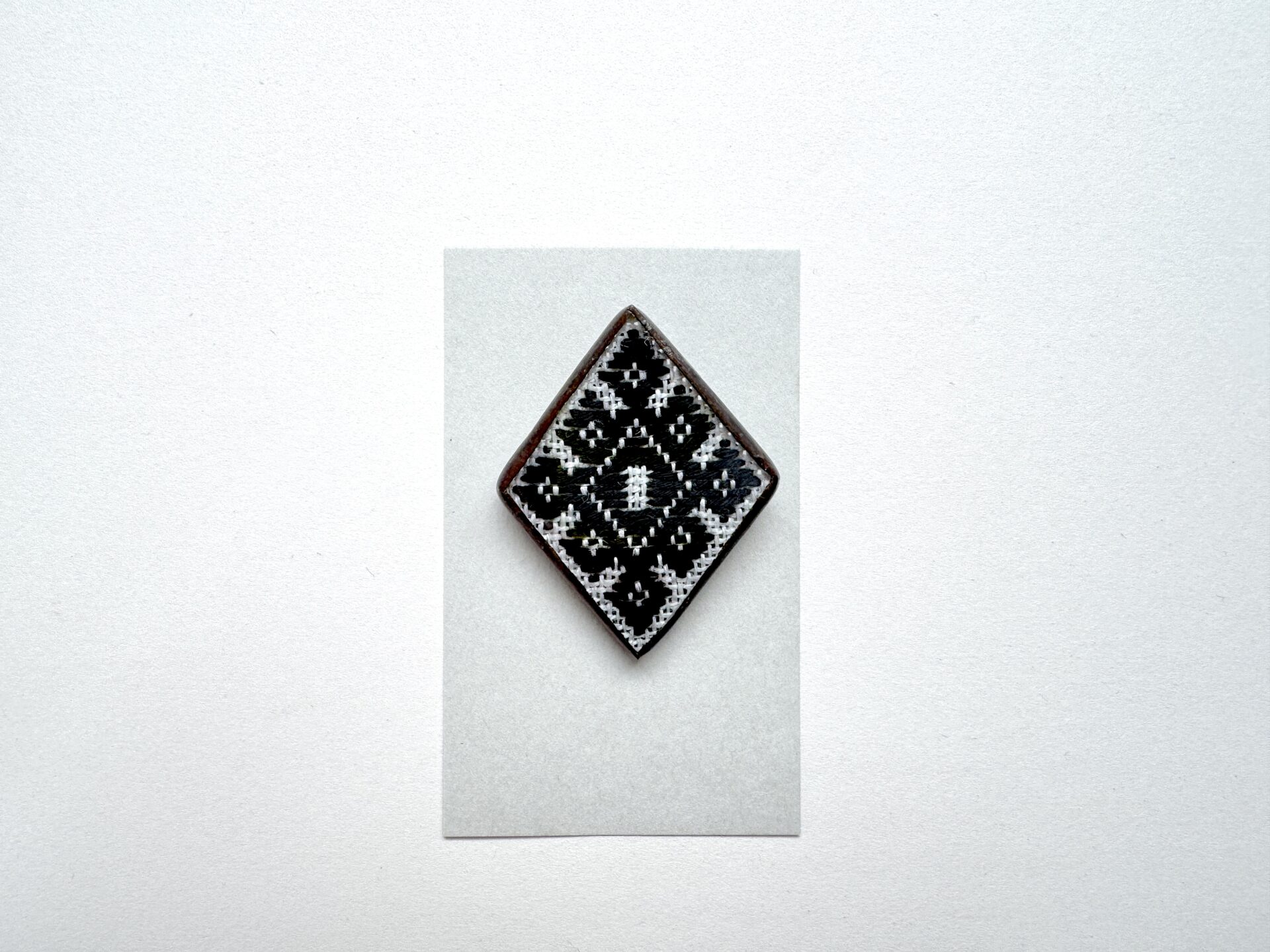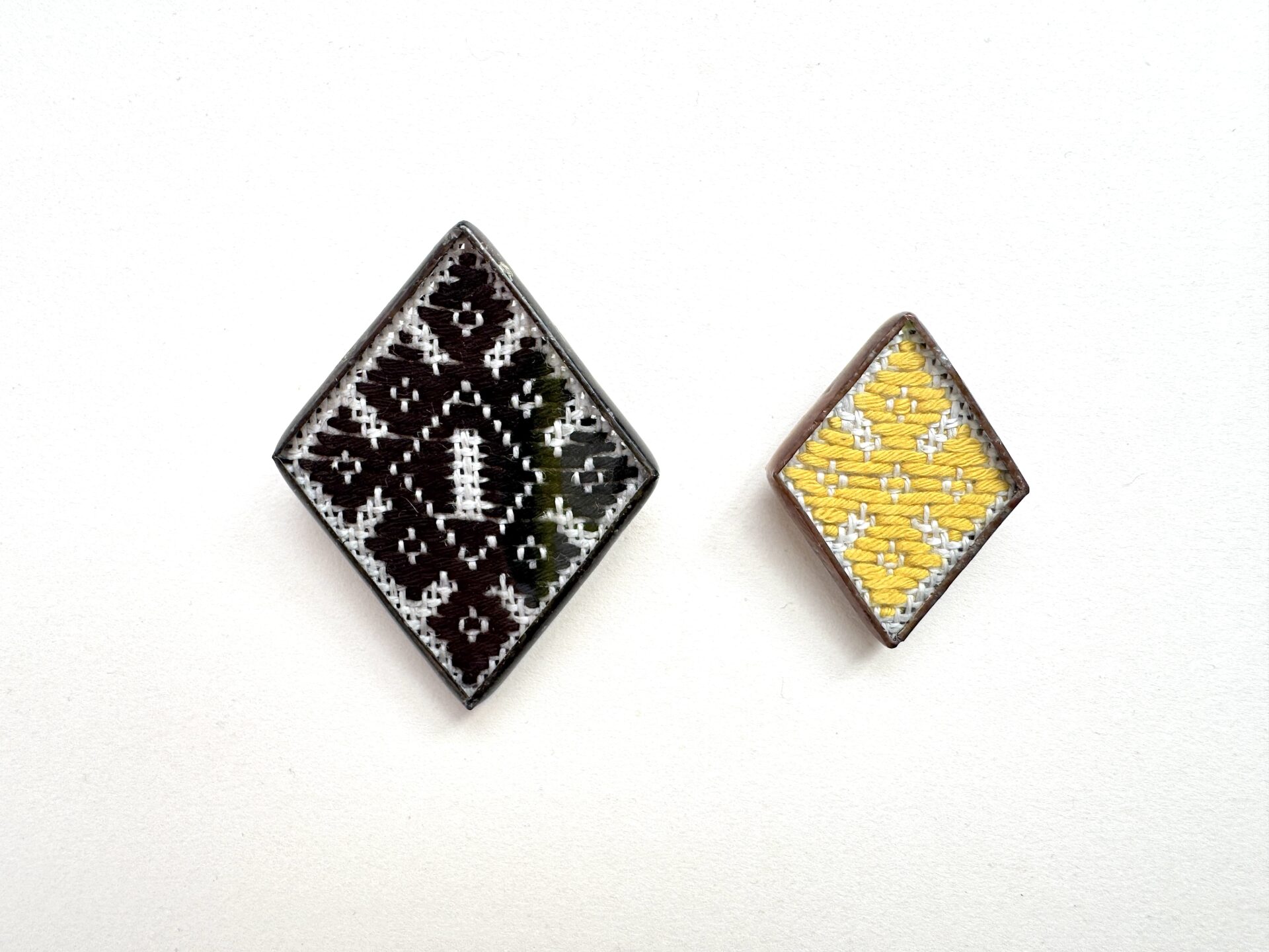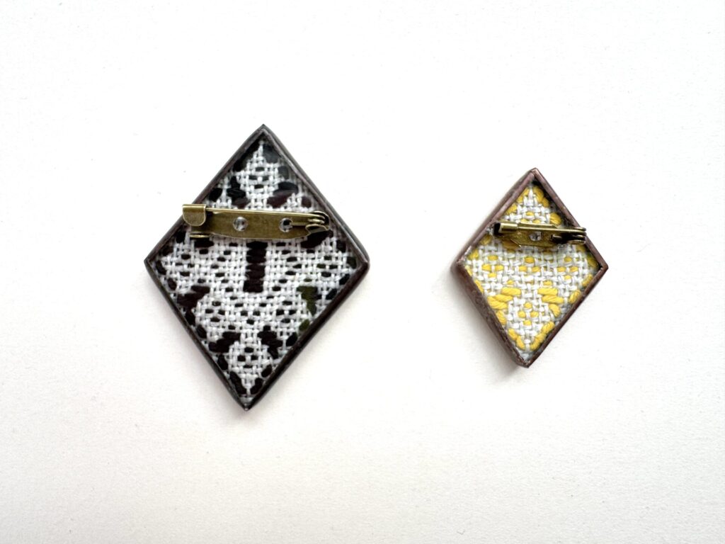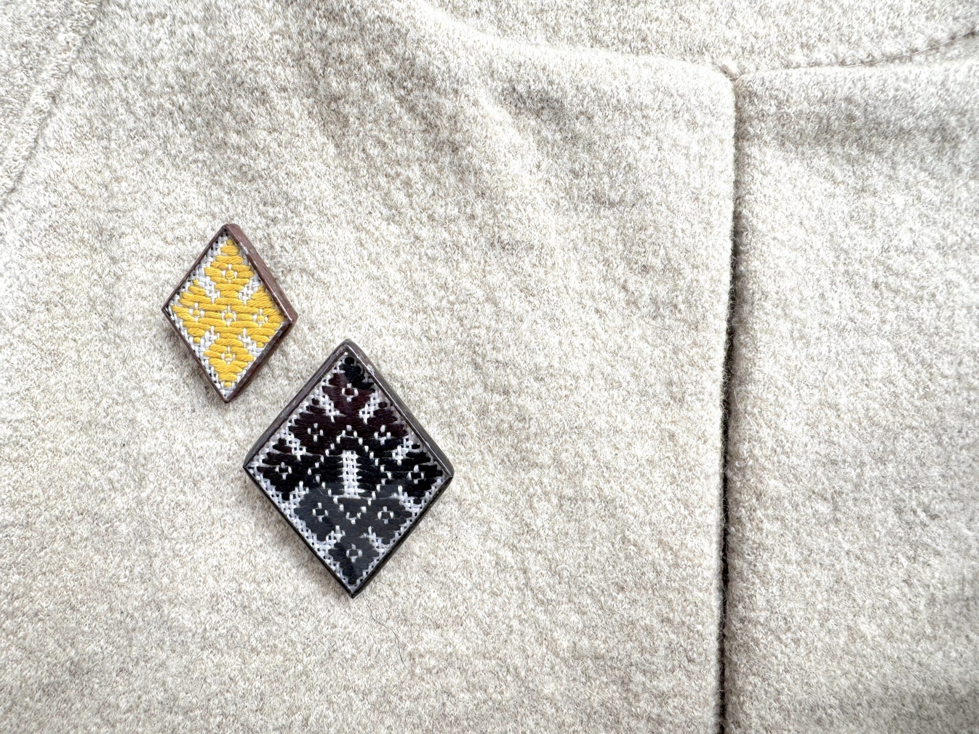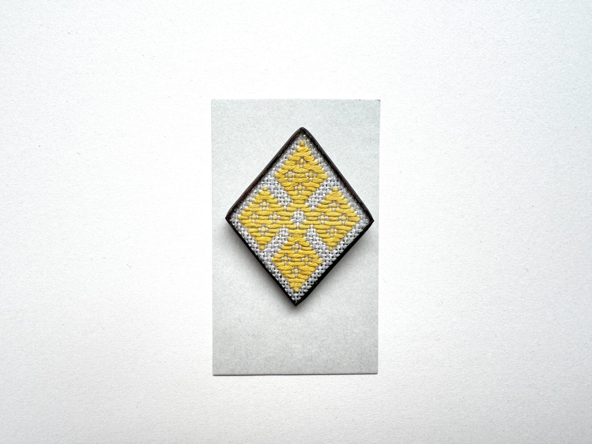 こぎん刺し作家・ハリノヲト植木友子さんに学び、ステンドグラスの技法を用いてこぎん刺し独特のモドコ(図案)をそのまま菱形のブローチに仕立てています。刺しものにガラスと金属のクールな質感が加わり、大人の装いにぴったりのブローチに。