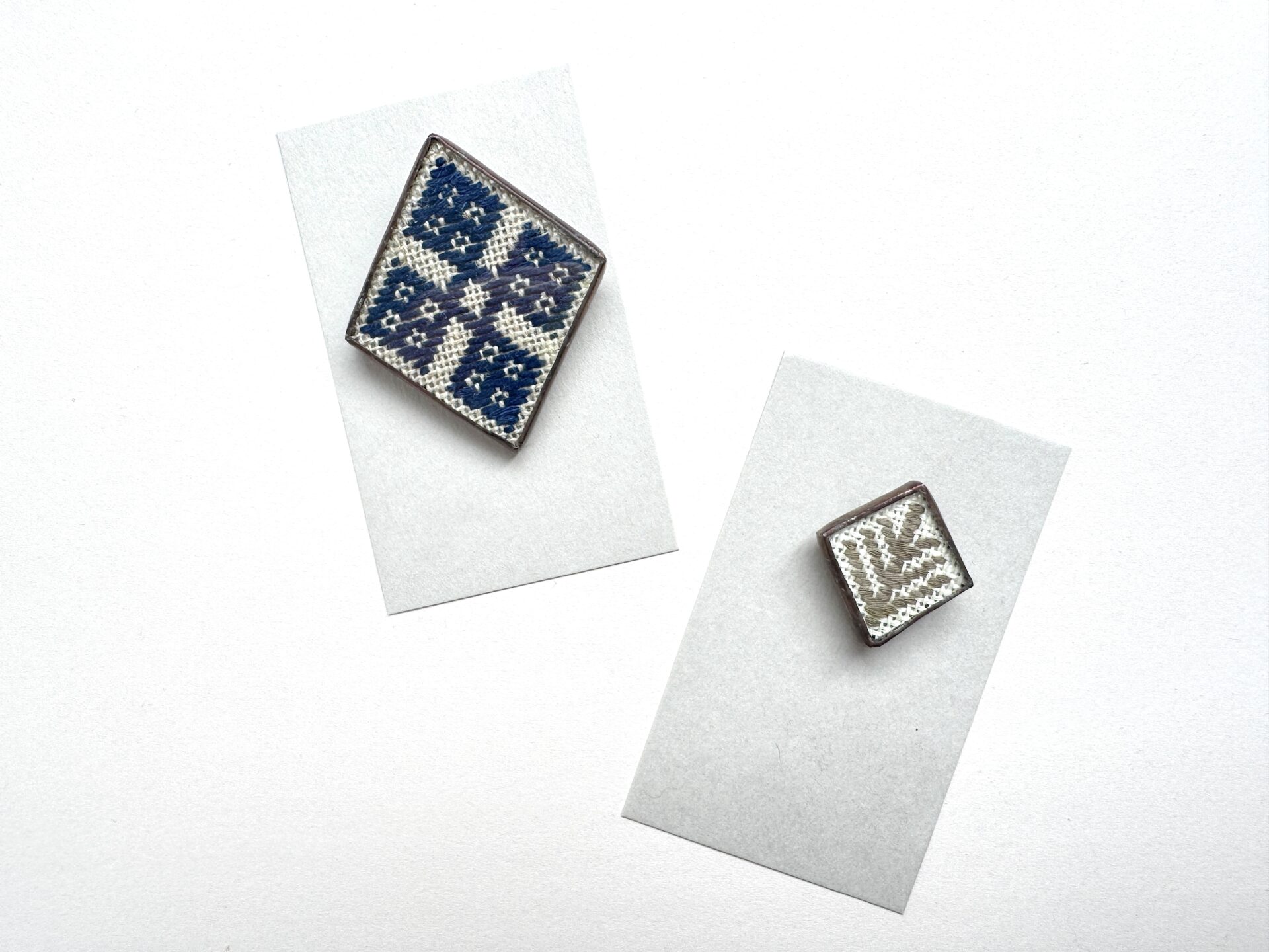 こぎん刺しは表面だけでなく、裏面にも文様が浮かび上がりますが、裏面の美しい仕上がりも必見です。ブローチ(小)と重ね付けも素敵です。