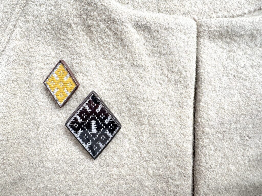 こぎん刺しは表面だけでなく、裏面にも文様が浮かび上がりますが、裏面の美しい仕上がりも必見です。ブローチ(大)と重ね付けも素敵です。
