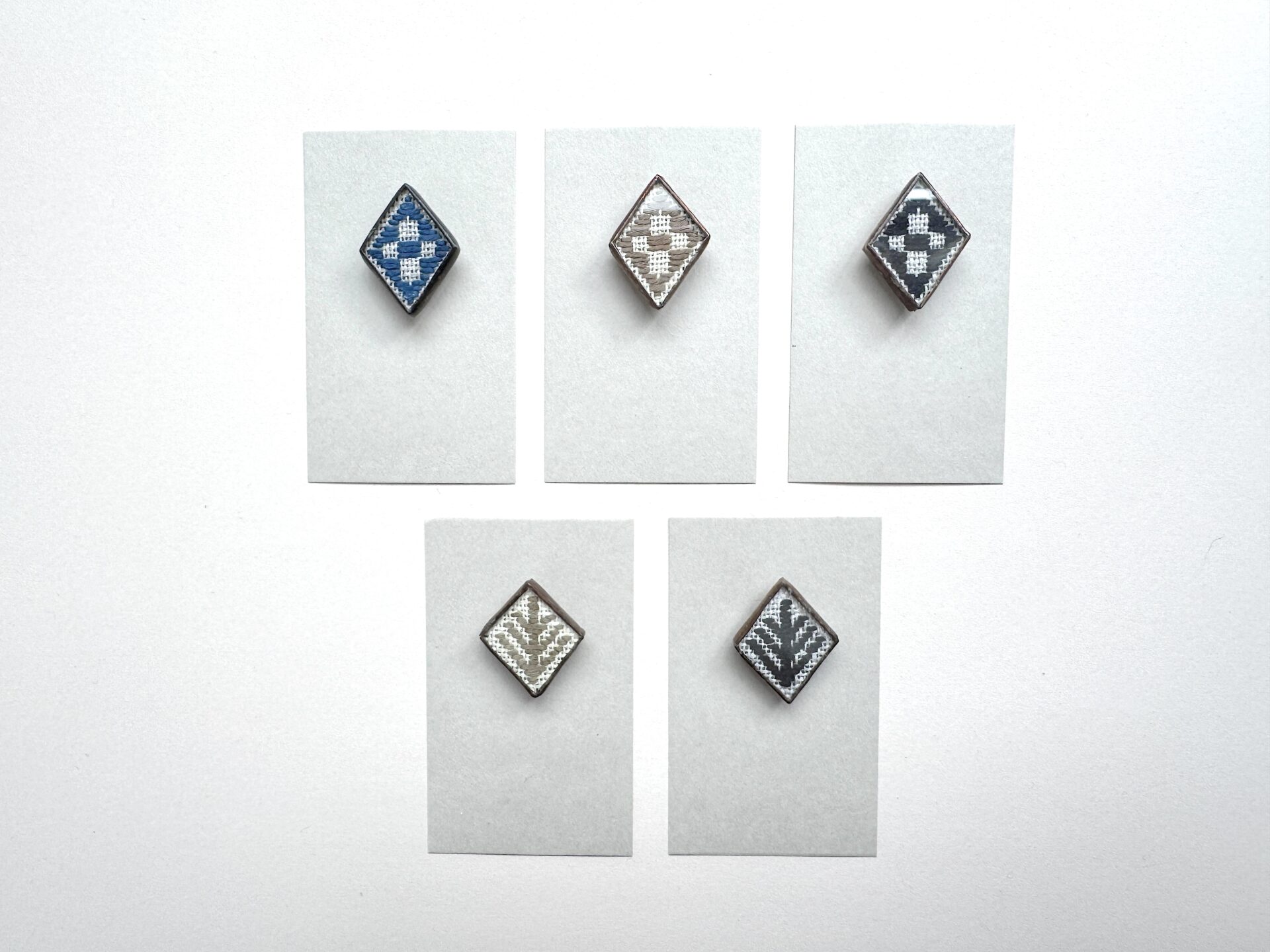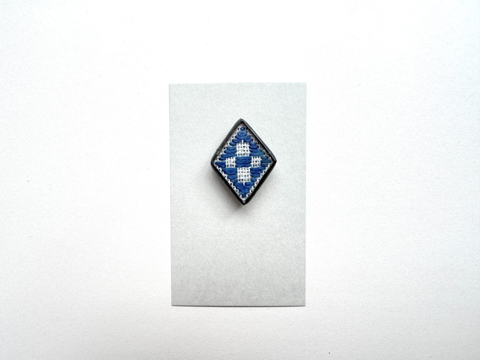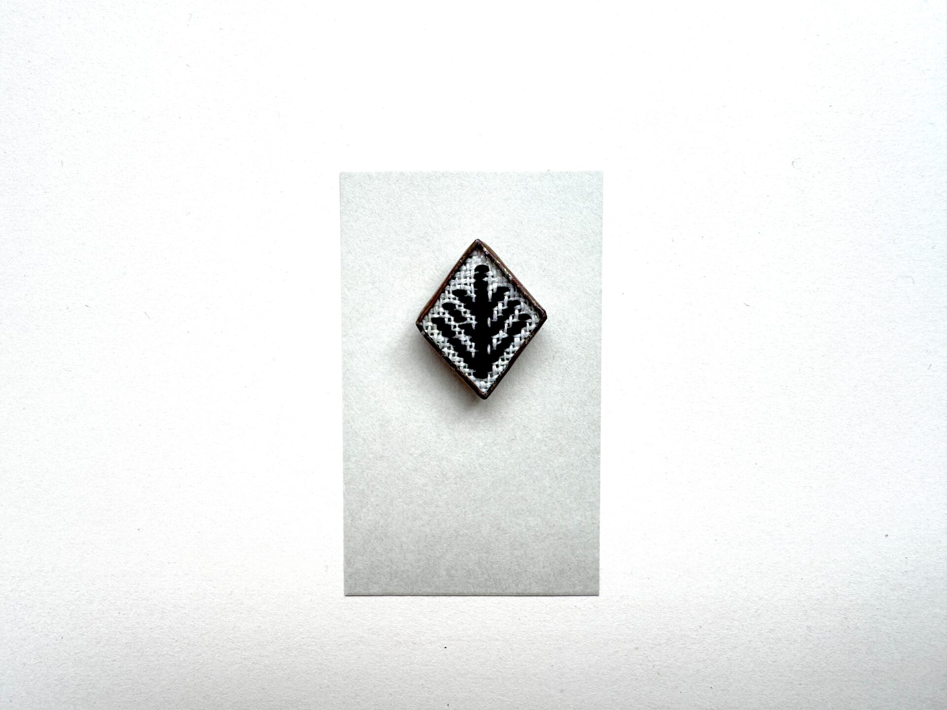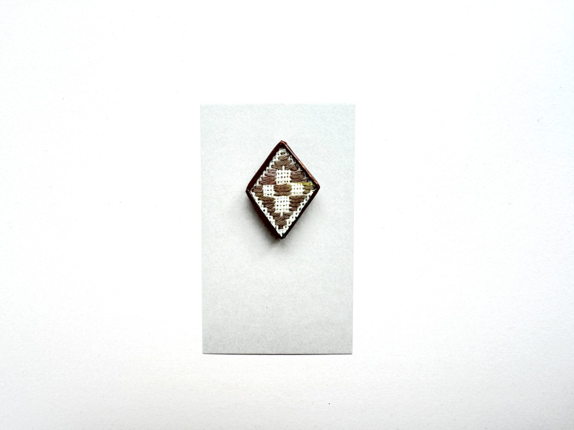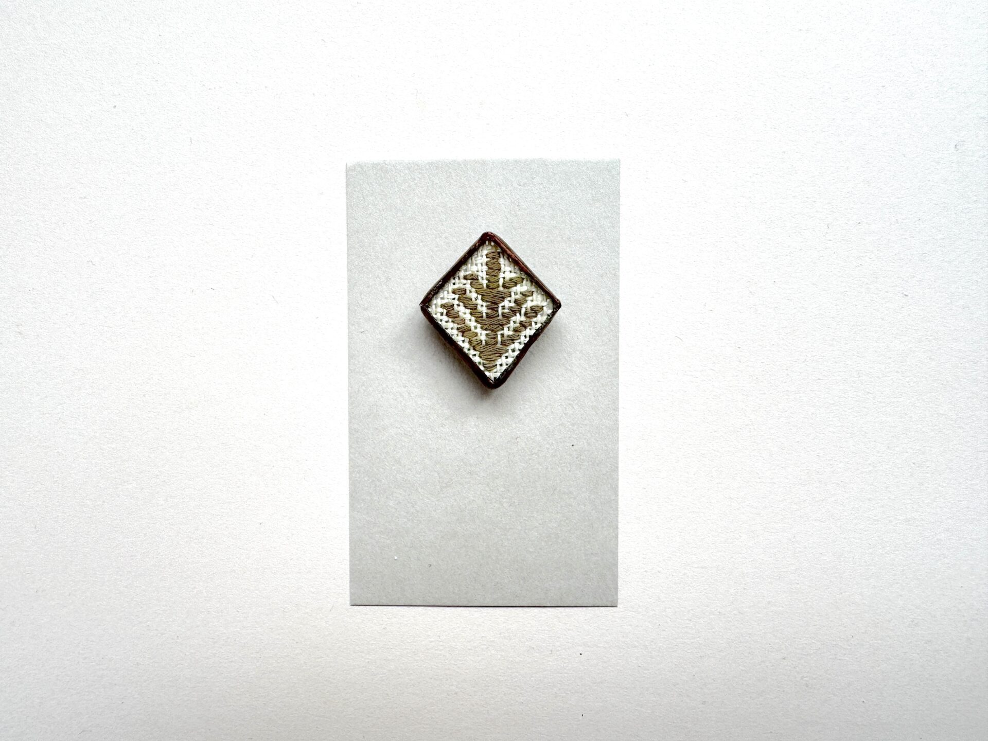 こぎん刺し作家・ハリノヲト植木友子さんに学び、ステンドグラスの技法を用いてこぎん刺し独特のモドコ(図案)をそのまま菱形のブローチに仕立てています。刺しものにガラスと金属のクールな質感が加わり、大人の装いにぴったりのブローチに。
