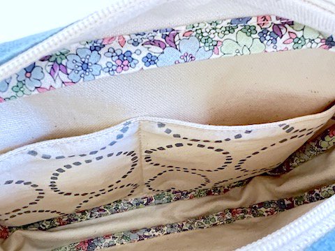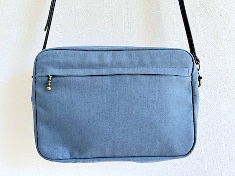 こぎん刺し作家・ハリノヲトとバッグ作家・yu*yuのコラボバッグ「スクエアポシェット」です。A5サイズがすっぽり入る大きさ、前面の大きなオープンポケットがこぎん刺しで仕立てられています。背面にも小物の収納に便利なファスナーポケット、内側には2分割のオープンポケット付き。